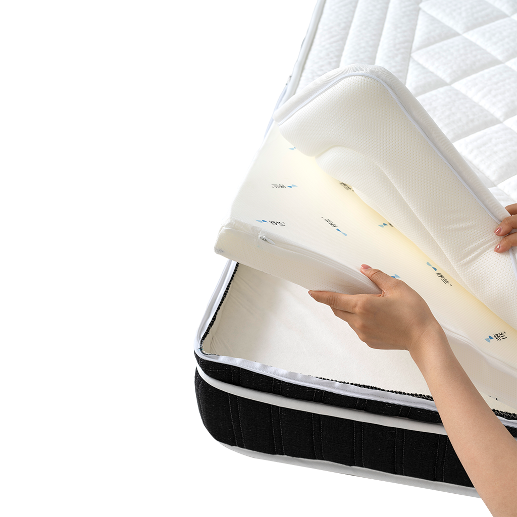 一张可拆卸的硬床垫裥棉层 :德国波迪 Avocado ?针织面料 +sorona杜邦绵 +1cmO2 ’Foam 8.0? 第8代 氧气绵 +网眼布 内结构: Ultra hard' SupFoam? 超硬 ’支撑绵 4cm 夹层 :依沃珑防螨布 独立抗扰自适应弹簧系统 +边缘加固支撑系统 15cm